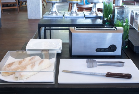 Freshly baked baguette in box with knife on butcher for self service breakfast