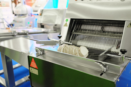 Bread slicing machine. Sliced bread on the production line of food and bakery products.