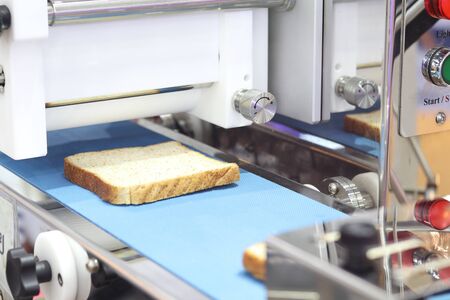 white bread in blue conveyor equipment line for processing ; food and drink industrial background