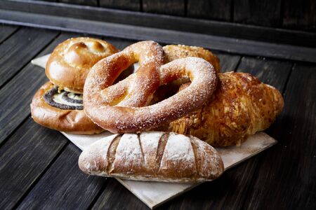Various baked products on dark wooden rustic table