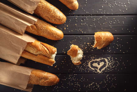 French baguettes in paper bags on black wooden background, heart drawn on sesame seeds