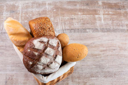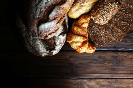 Assortment of baked bread and bread rolls on rustic table background.