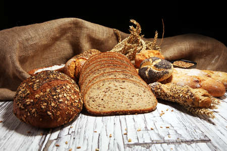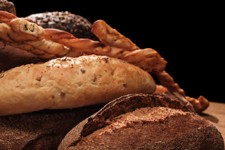 Different fresh bread with seeds and wooden bottom with crumbs, on black background. Useful as baker background