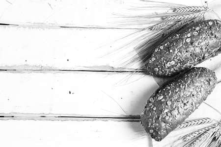 Tasty fresh black and white bread with wheat and flour on a white background