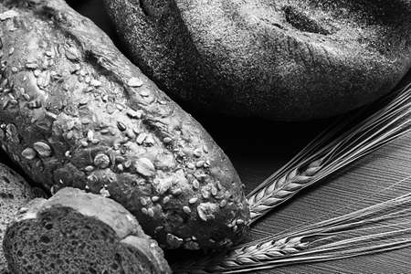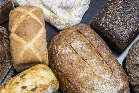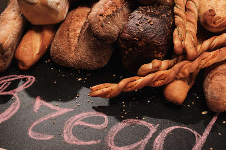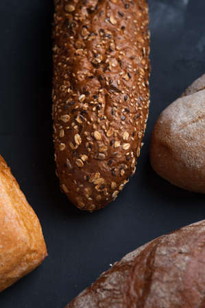 Many various wholegrain baked breads top view close-up