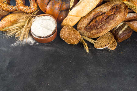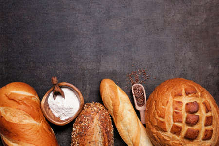 Homemade natural breads. Different kinds of fresh bread as background, top view with copy space.