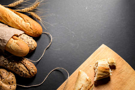 Assortment of various delicious freshly baked bread, on black concrete background top view copy space