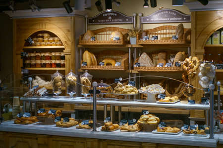 Moscow, Russia - October 5, 2019: Fresh pastries on display in a pastry shop