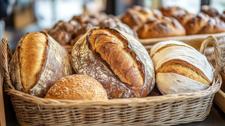 Freshly Baked Artisan Bread Displayed in Rustic Baskets at a Bakery. High quality photo