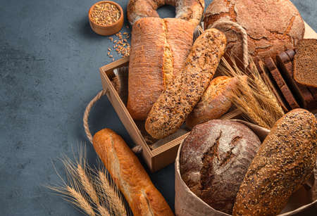 Assortment of rye and wheat bread, and wheat spikelets on a dark background. Side view, copy space.