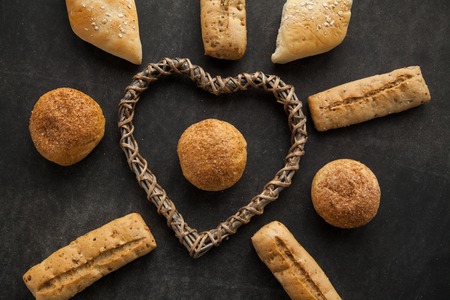 Concept of gluten free buns for allergic people with disease. Variation of bread with wooden heart shape on dark background.
