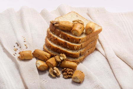 bread, hardtack and walnut on background with soft shadow