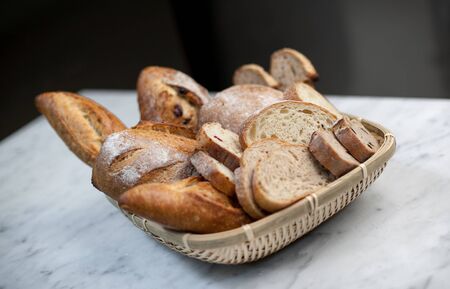 Different kinds of fresh homemade bread in a basket.
