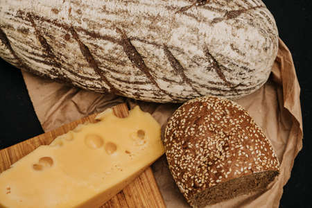 Fresh bread and cheese on paper on wooden black background