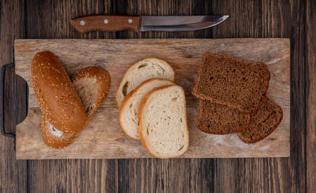 top view of sliced breads as seeded brown cob white and rye ones on cutting board and knife on wooden background