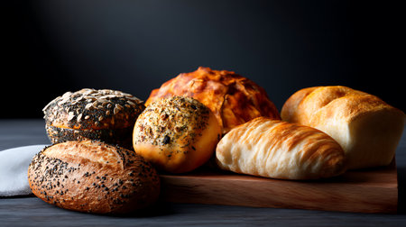 A selection of different types of rye and wheat bread arranged on a dark background. These bakery products are freshly baked and feature various textures and shapes. Perfect for adding to your food or cooking related designs.