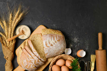 Freshly baked sourdough bread with fresh egg and accessories bakery on black table