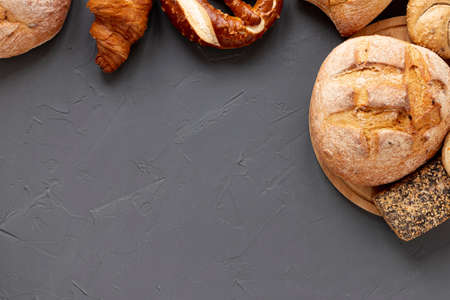 Bakery - different kinds of breadstuff. Bread rolls, baguette, bagel, burger bun and croissant captured from above (top view, flat lay). Gray background with free copy (text) space.
