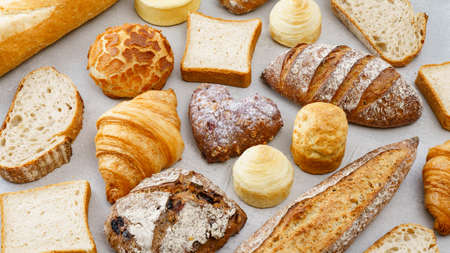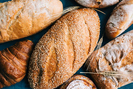 Flat lay bread background. Freshly baked assortment of bread.