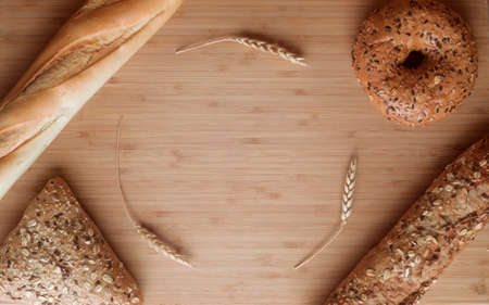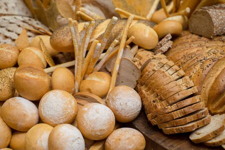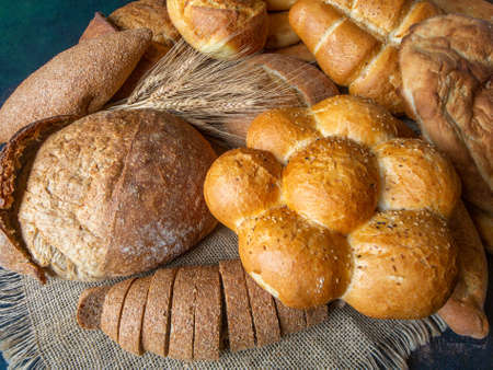 Different types of bread, fresh pastries in the bakery. Bread with sesame seeds, cereals, seeds. Different forms and types of rolls. Wheat ears on a wooden board. Place for text or logo, discounts