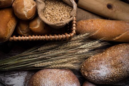 top view of the assortment of delicious baked bread of various shapes from flour of different varieties. a copy of the space.