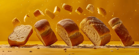 Sliced Bread Loaves in Mid Air on Vibrant Yellow Background Levitation Concept for Bakery Products AI Generative