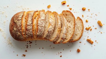 Detailed shot of a sliced loaf of bread with a soft interior and crispy crust, arranged on a white surface with crumbs scattered around.
