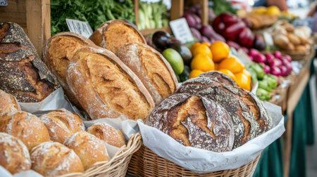 A vibrant farmers market scene featuring an assortment of freshly baked breads alongside colorful fruits and vegetables, highlighting local produce and promoting healthy living.