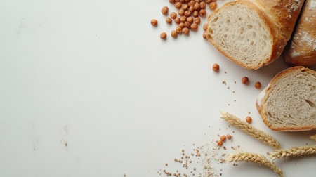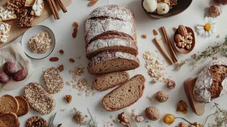 A visually appealing arrangement of freshly baked bread divided into slices, surrounded by grains and nuts, ideal for showcasing the essence of baking and healthy eating.