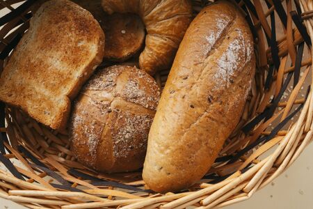Various types of bread served on a wicker tray, delicious and fresh rolls, morning food
