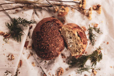 Fresh tasty fragrant handmade bread close-up. Homemade baking.