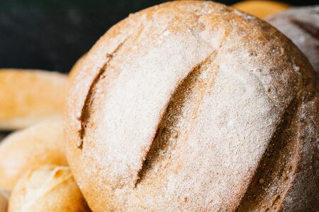 Fresh fragrant bread on the table. Food concept Wheat pastry on black background