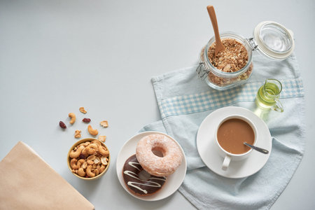 From above shot of coffee cup served with doughnuts and granola in jar on table with nuts