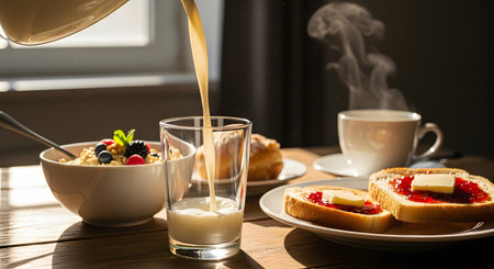 Fresh milk is being poured from a pitcher into a glass on a sunlit breakfast table. The table is set with a bowl of oatmeal with berries, toast with jam and butter, and a cup of coffee, depicting a wholesome morning meal.