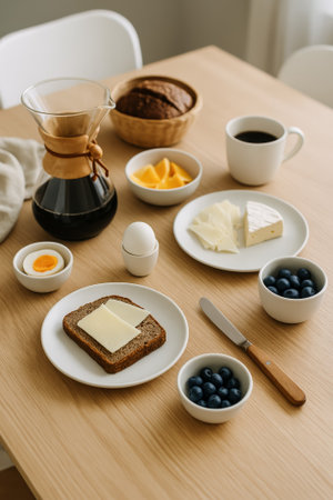 A well-arranged breakfast with coffee, toast, fruit, and soft cheese on a wooden table