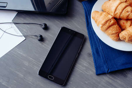Closeup of wooden desktop with coffee, croissant, phone with headphones and notepad