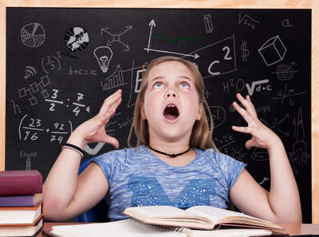 Hooked on learning. Hometask concept. Small kid study school. Girl cute child sit school classroom chalkboard background. School lesson. Progress and achievements. Back to school. Knowledge day