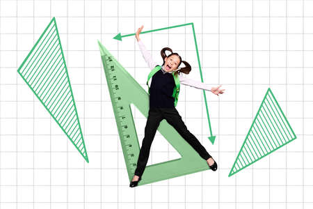 Creative collage picture of overjoyed small girl jump big triangular painted geometric figures checkered copybook pattern paper