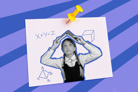 Artwork collage of mini black white effect girl painted pinned paper list hold book above head mathematical equation isolated on creative background