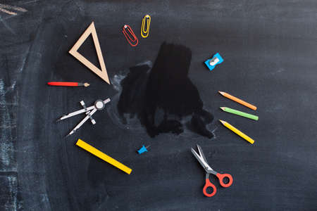 Close-up different chalks and office supplies placed on empty chalkboard.