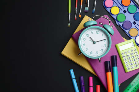 Flat lay composition with alarm clock and different stationery on blackboard, space for text. school time