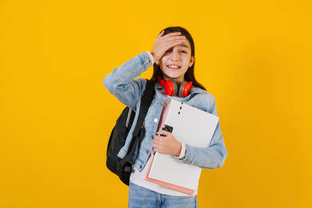 portrait of young hispanic child teen girl student with worried expression on a yellow background in Mexico Latin America