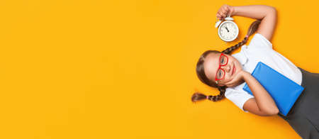 Back to school concept. Shocked pupil with an alarm clock and a book on a yellow background. Top view banner.