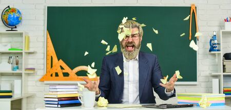 Teacher destroying paper file. Get free education. Destroy profile documents. Study hard. School education for everyone. Modern education requirements. Private school advertising boost enrollments