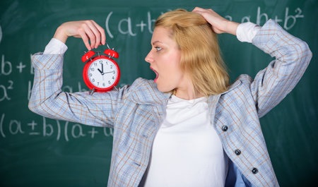Educator start lesson. She care about discipline. Woman teacher hold alarm clock. Lessons schedule concept. Time for break. Girl wonder about time. Welcome teacher school year. Healthy daily regime