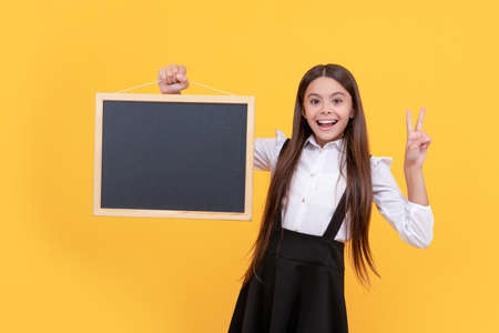 smiling teen girl in uniform hold school blackboard for copy space showing peace, school sale.