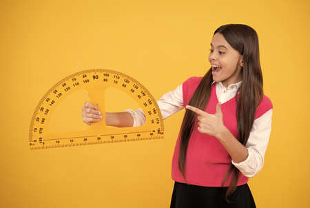 what angle you look. surprised child with triangle. teenage girl with ruler. Portrait of schoolgirl student, studio banner header. School child face, copyspace.