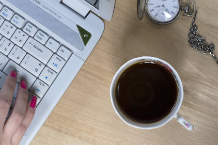 An overhead closeup shot of a businessman in formal attire holding a mug and typing on a computer keyboard