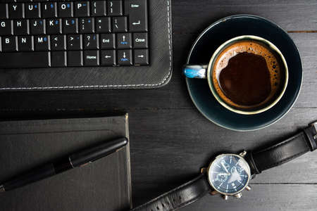 Overhead shot of dark modern workspace with laptop, stationery, coffee cup and copy space on black table