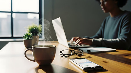 A warm and inviting scene featuring a laptop with a 'take a break' note, a steaming cup of coffee, and a comfortable setting, promoting relaxation and rest.